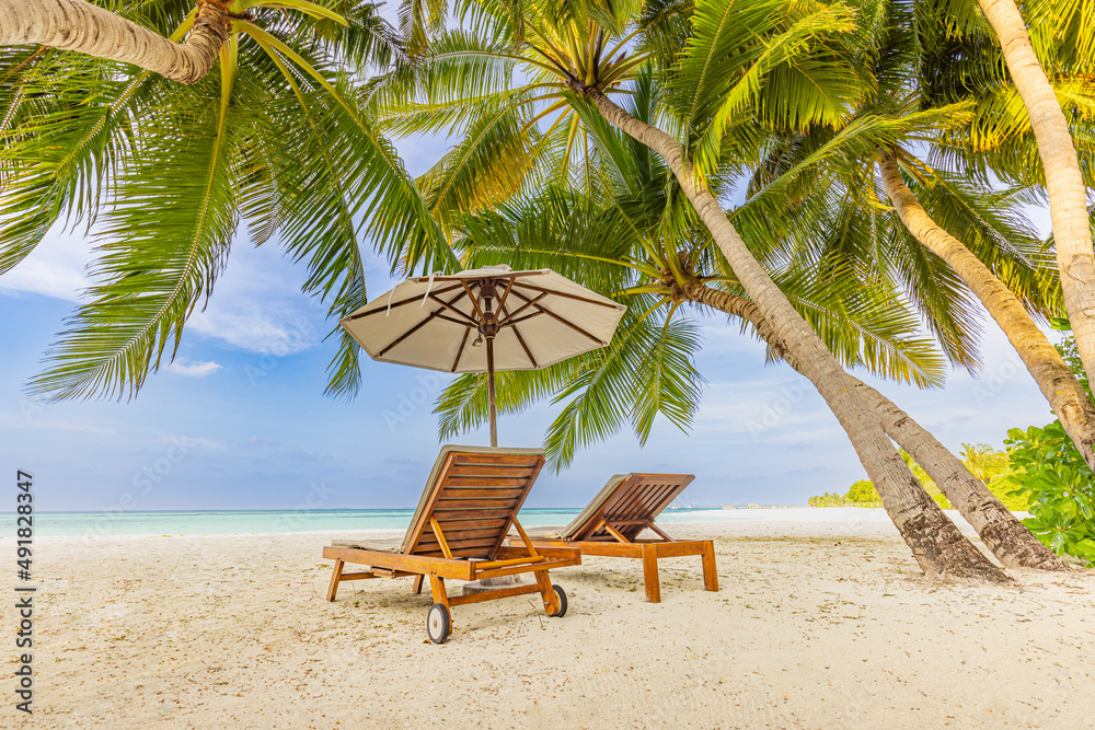 Amazing vacation beach. Chairs on the sandy beach near the sea. Summer romantic holiday concept for tourism. Tropical island landscape. Tranquil shore scenery, relax sand seaside horizon, palm leaves
