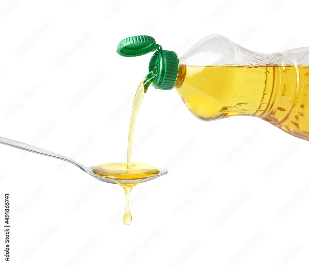 Pouring cooking oil from plastic bottle into spoon isolated on white background.