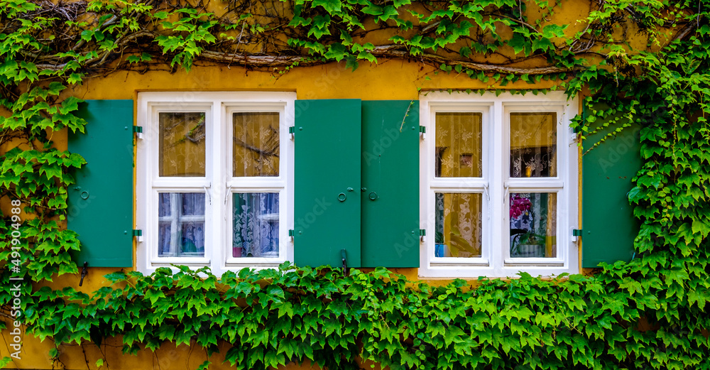 old overgrown window at a facade