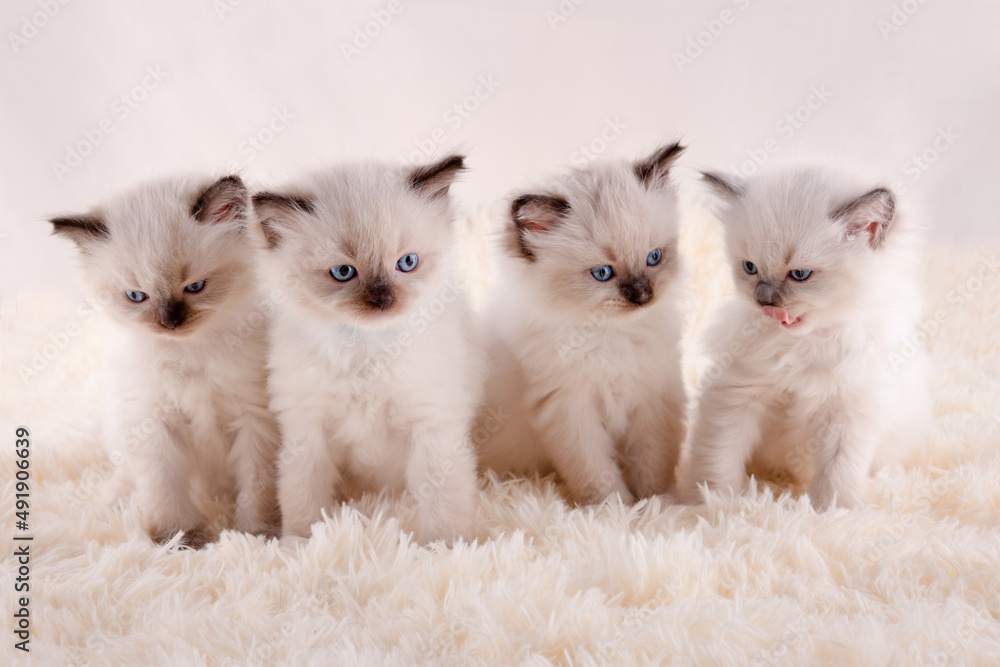 four ragdoll kittens with blue eyes sitting on white rug on a white background