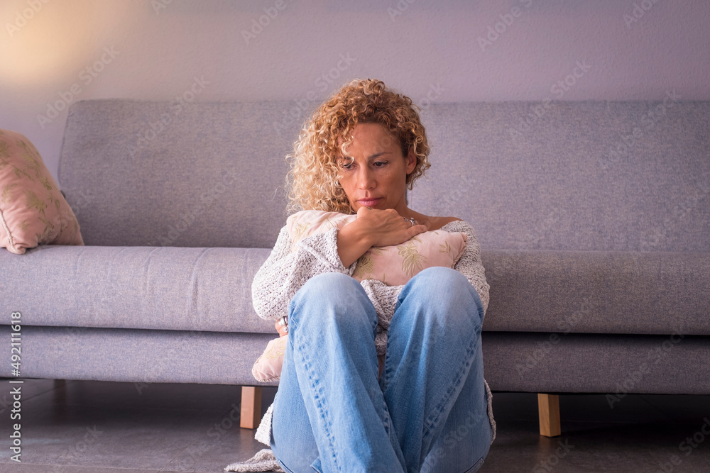 Sad and depression illness concept with woman sitting on the ground alone at home looking on the floor. Lonely adult female people hugging pillow. Female with fear protect herself.