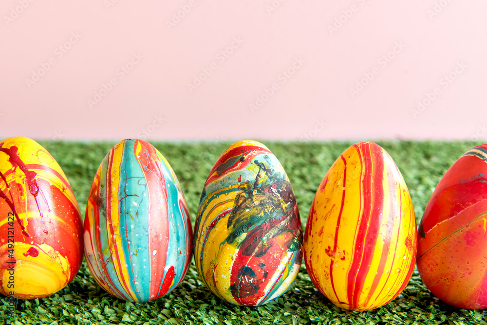 Decoration with colored easter eggs on grass background.