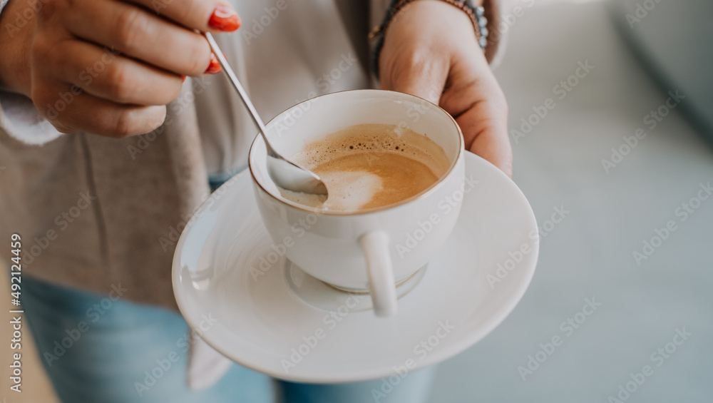 Filiżanka z kawą w dłoniach kobiety w słoneczny poranek w domu