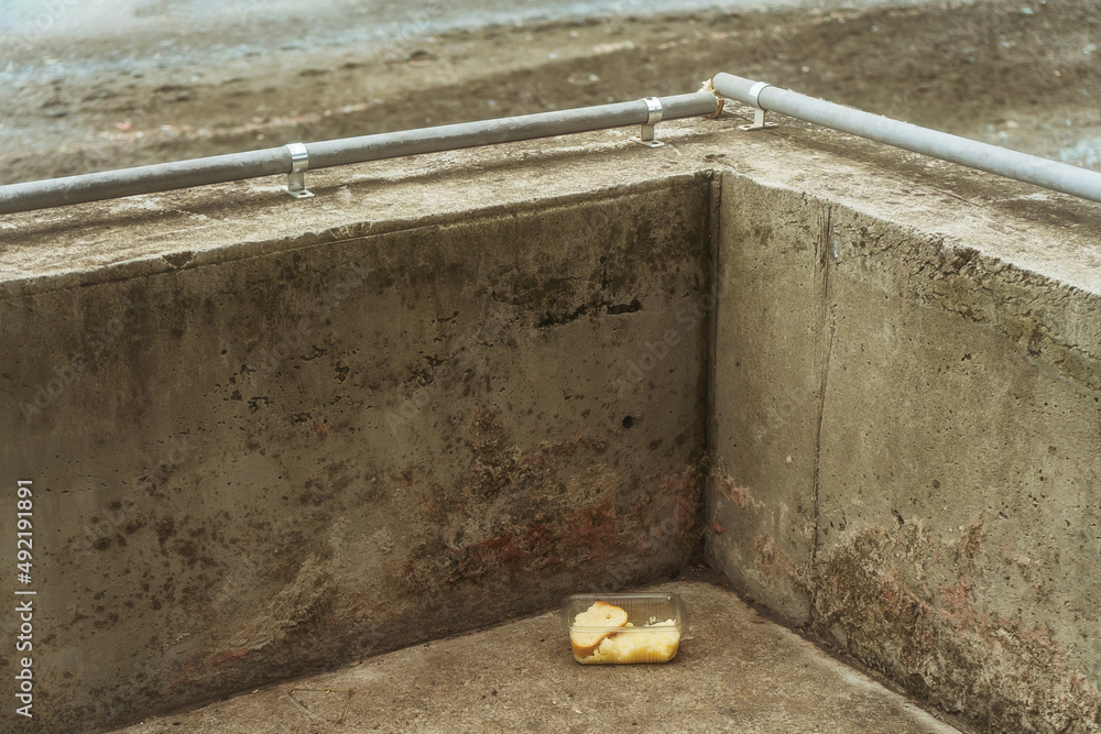 Leftovers on the ground in a plastic container on the embankment. Unfinished food on the street