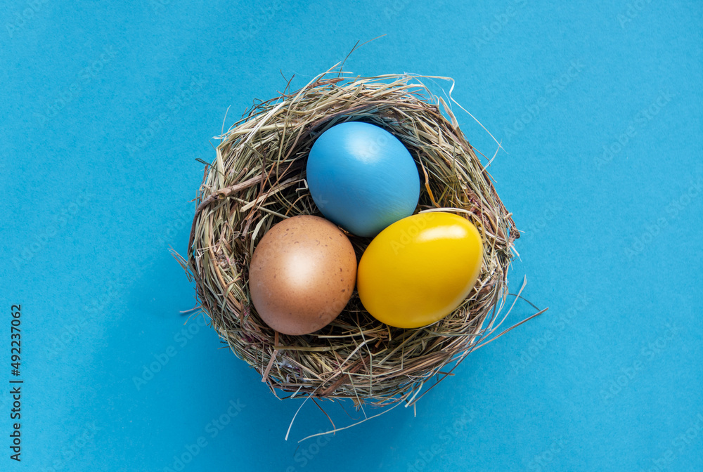 multi colors painted easter eggs in colors flag of ukraine yellow and blue. Happy Easter holiday card