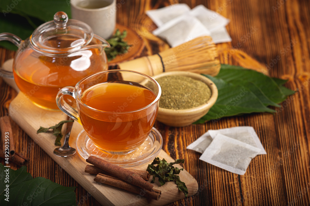 Cup of Kratom tea with fresh green kratom leaf or Mitragyna speciosa on wood background.