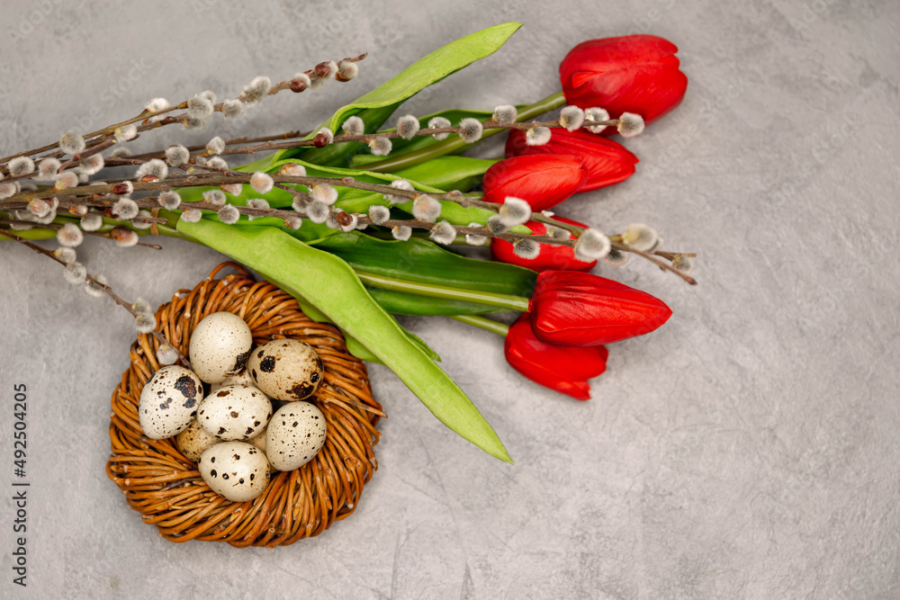 Quail eggs in the brown twig nest . A bundle of five blossoming red flowers and willow branches. Easter decoration on the grey concrete background. Easter decoration with the copyspace.