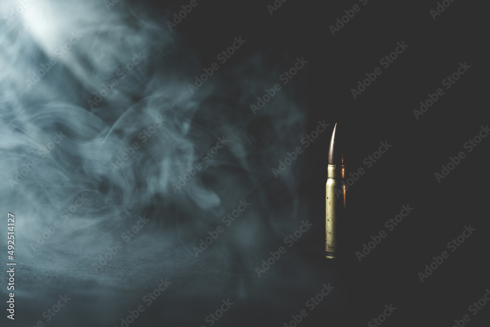 Assault rifle bullet in smoke on black background. Assault rifle bullet vintage background photo. War and death concept.