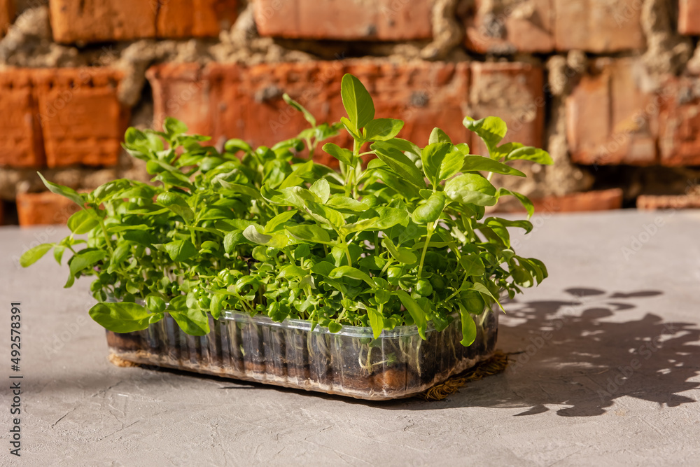 Growing healthy vitamin greens at home. Aromatic herbs. Healthy eating concept. Beautiful sprouts of microgreens. Sprouted basil germinated from high quality organic plant seed. Vegan, vegetarian food
