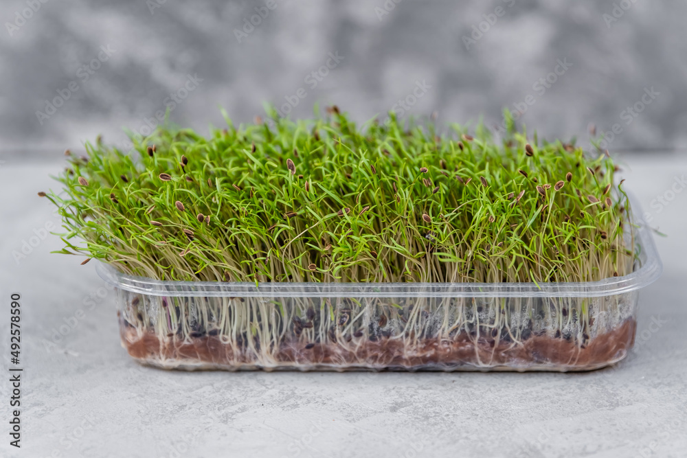 Microgreens in container. Sprouting microgreens. Seed germination at home. Vegan and healthy eating concept. Seed packaging. Sprouting seeds of a plant. Growing sprouts. Organic raw green food.