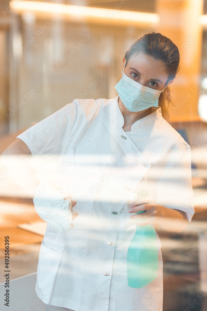 Young woman cleaning windows of a reception of a clinic