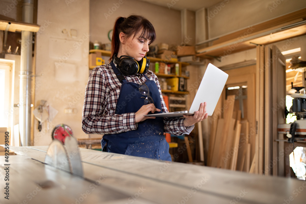 Carpenter woman using laptop with blueprints and planning work in her carpentry workshop