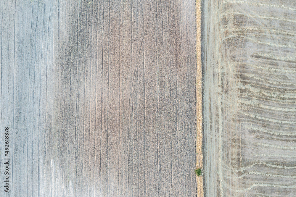 drone aerial photography concept of abstract texture of plowed agriculture field and already harvested wheat grains