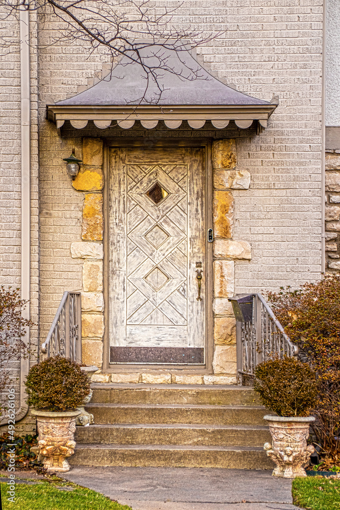 Unusual rustic wooden door surrounded by rock trim in light colored upscale brick house with awning on winter day with all bushes dead and brown