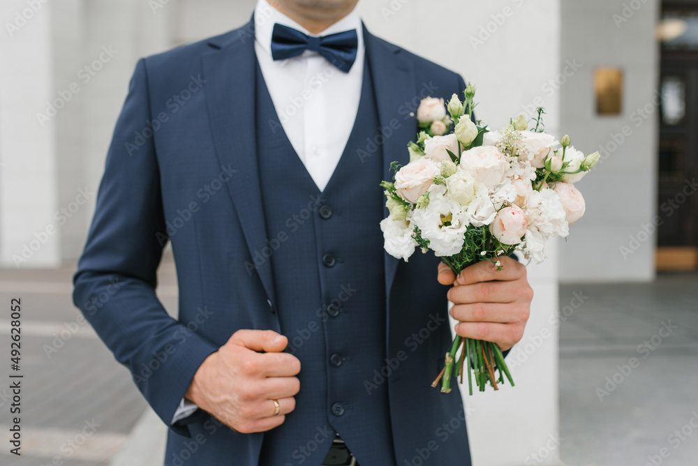 The groom in a blue suit holds in his hand a delicate wedding bouquet for his beloved bride