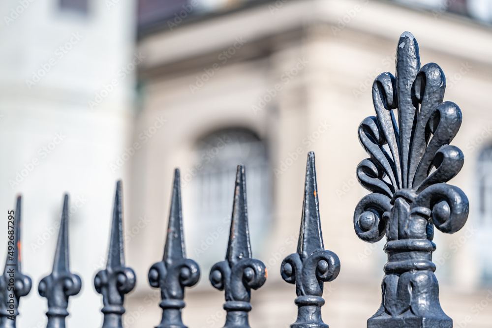 Shallow focus on a fleur de lis shaped iron gate in Jackson Square, French Quarter, New Orleans.