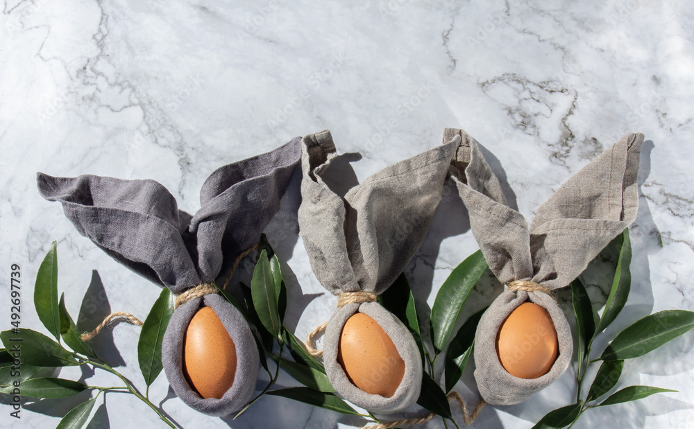 Festive easter background with Easter bunny eggs on linen napkin. Easter decoration, top view. Copy space