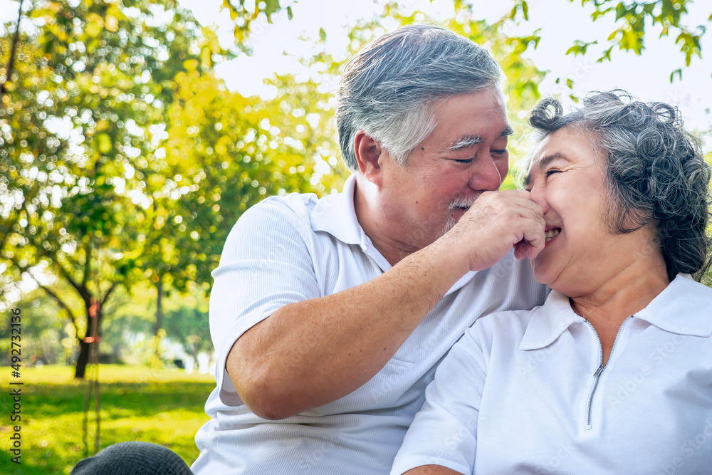Elderly couple sharing a lighthearted moment outdoors, with the man gently touching the woman's nose, both laughing and enjoying each other's company.