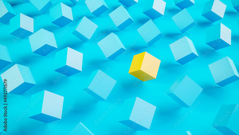 Freedom, individuality, non-conformity concept. Blue cubes turning an a corner. One yellow cube.