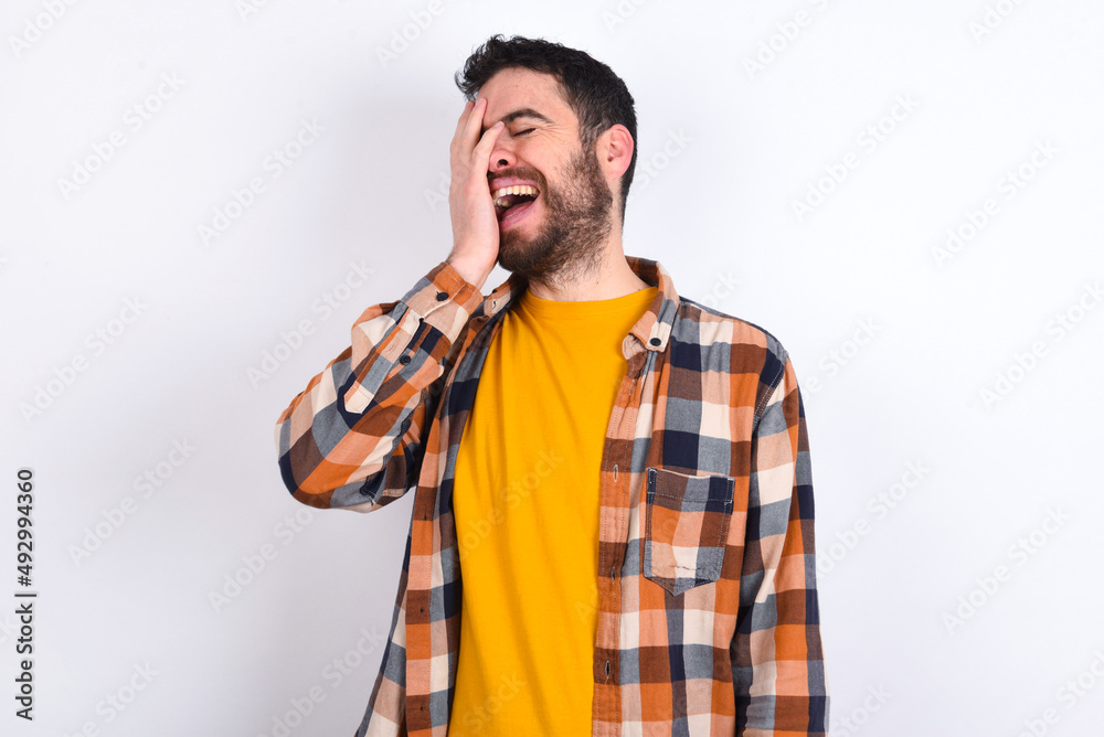 Charismatic carefree joyful young caucasian man wearing plaid shirt over white background likes laugh out loud not hiding emotions giggling hear funny hilarious joke chuckling facepalm.