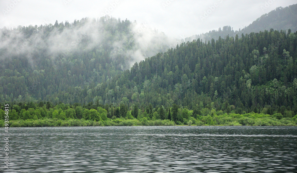 Fog descending the slope of a high mountain overgrown with coniferous forest on the shore of a large lake.