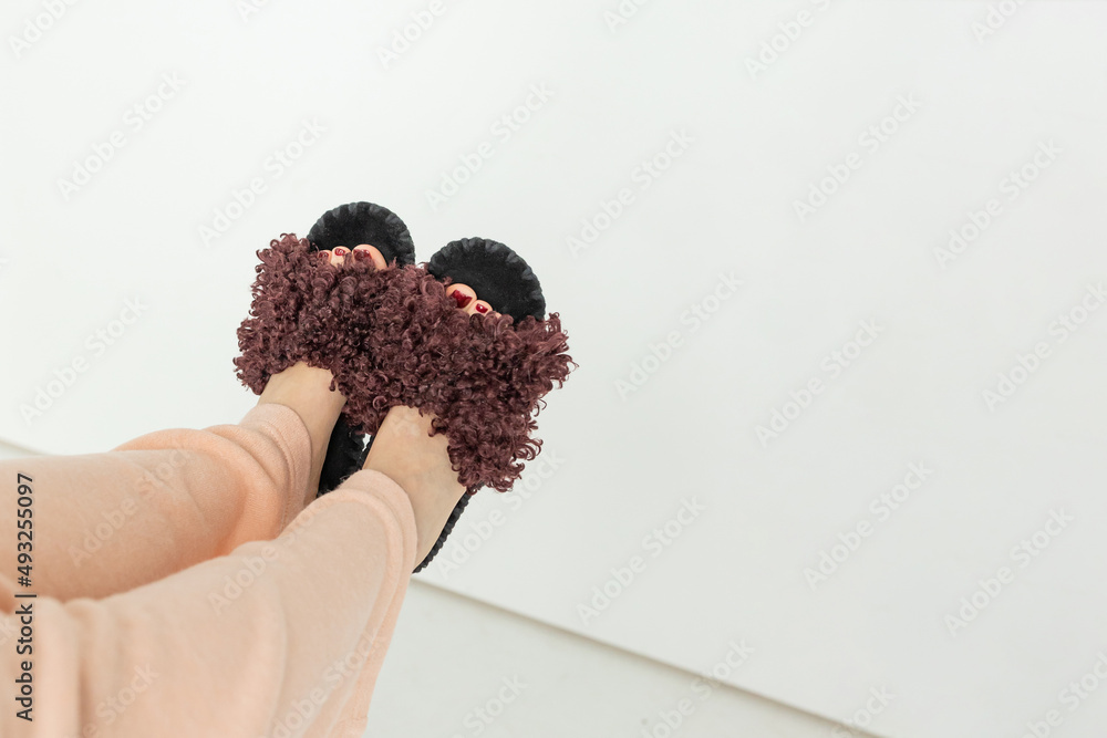 Young woman in soft cozy brown slippers resting at home