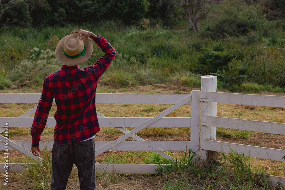 Male young black farmer working in front of the farmers gate. African Ayoung man in hat at farm with sunset.