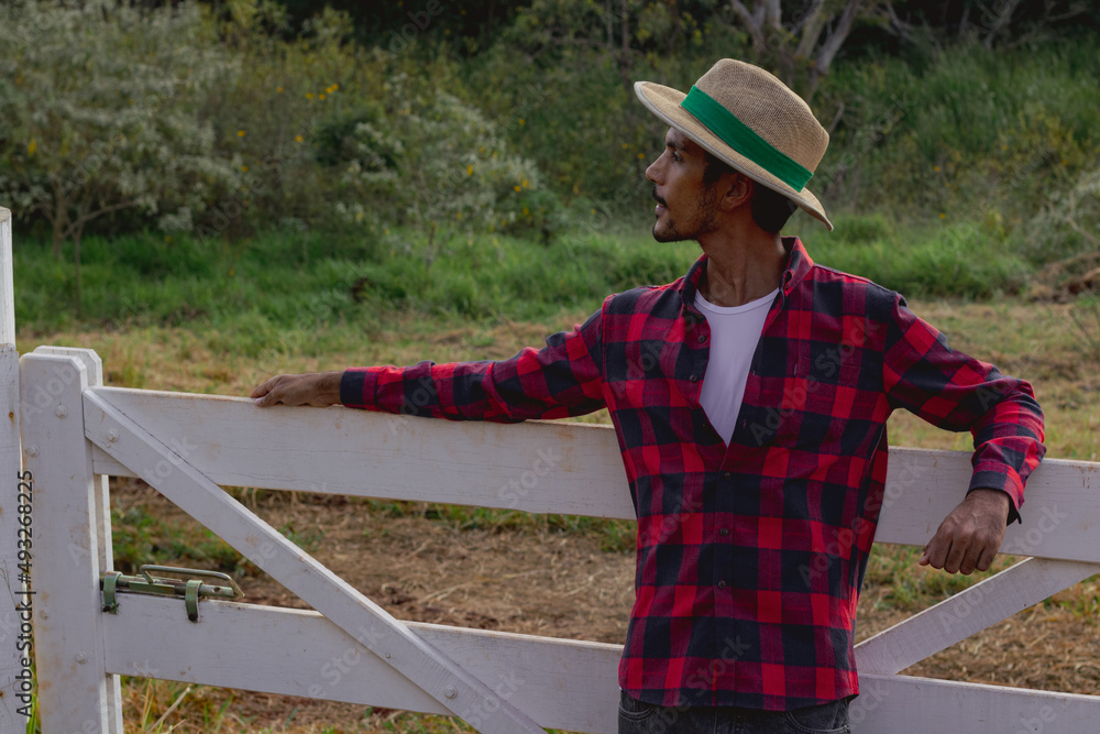 Male young black farmer working in front of the farmers gate. African Ayoung man in hat at farm with sunset.