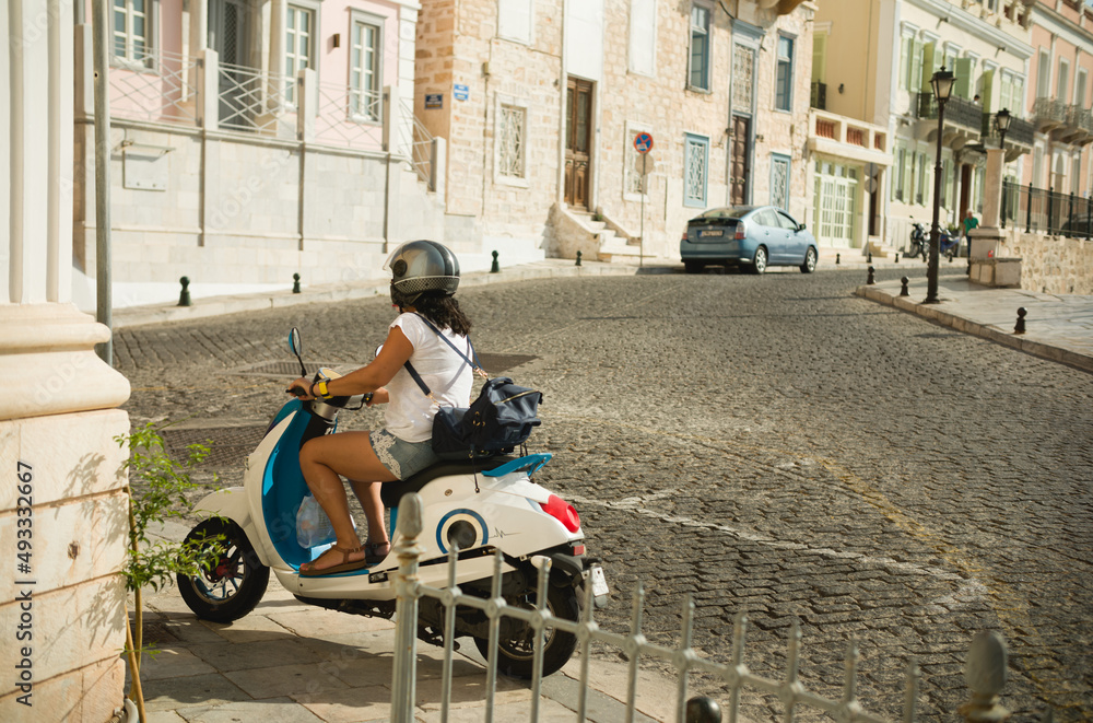 Electric scooter in gorgeous Ermoupolis most attractive cities in Cyclades, capital of Syros neoclassical mansions of exquisite taste and elegance, beautiful churches, and romantic alleys