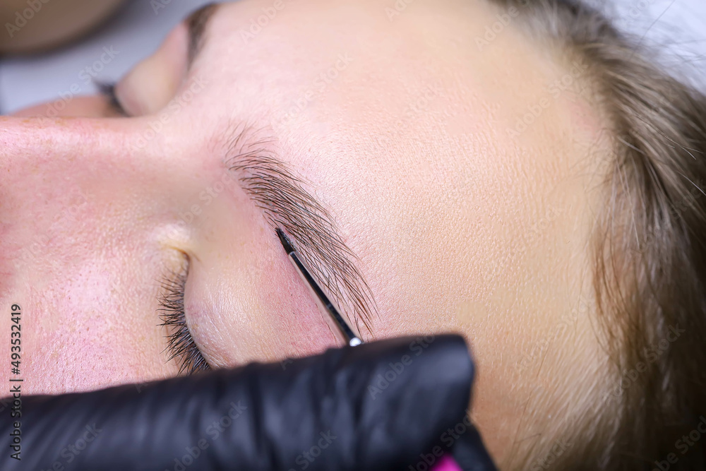 applying paint to the hair of the eyebrows after laminating the eyebrows with a thin brush