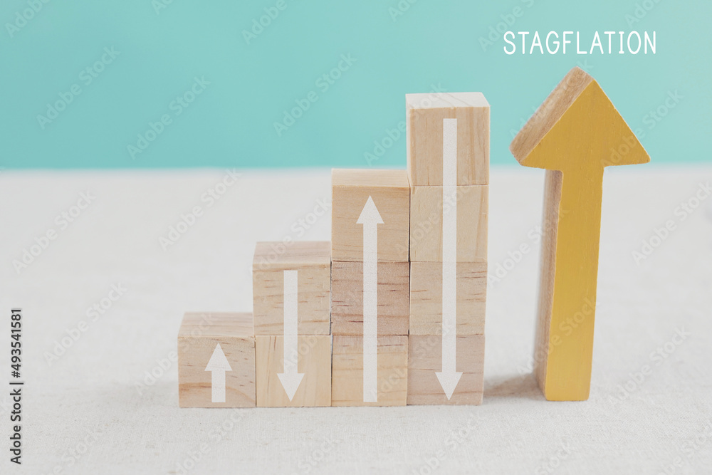 arrows up and down on wooden blocks ladder, Rising and inclining arrows, financial crisis, Stagflation concept