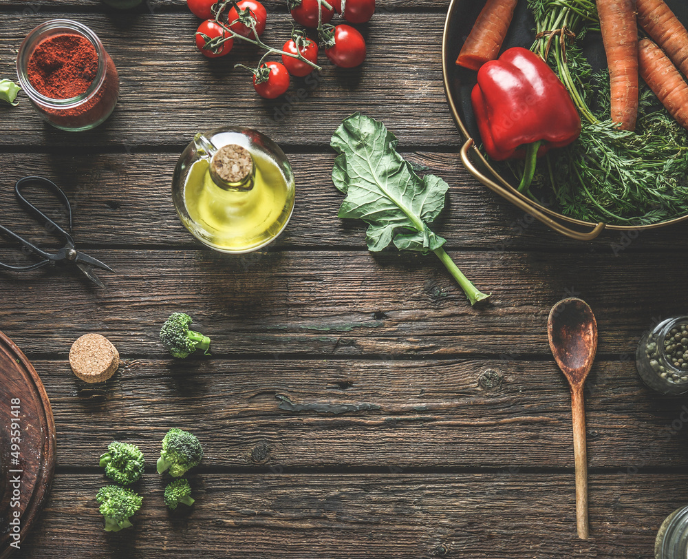 Food background with wooden spoon, healthy ingredients and kitchen utensils on rustic wooden table. Various vegetables, olive oil and spices. carrots, tomatoes, broccoli, bell pepper. Top view.