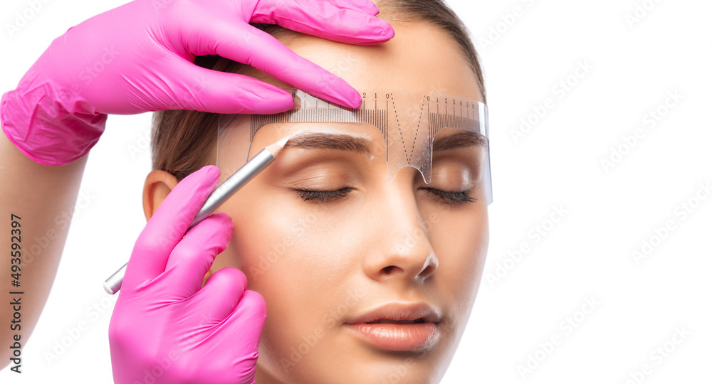 Make-up artist makes markings with white pencil for eyebrow and paints eyebrows. Professional makeup and facial care.