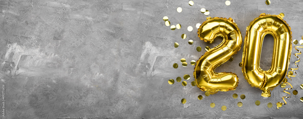 Yellow foil balloon number, number twenty on a concrete background. Birthday card with inscription 20. Anniversary concept. for anniversary, birthday, new year celebration. banner,