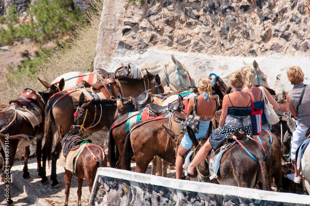 Rear view of a group of tourists on transport donkeys in summer on the island of Santorini Greece