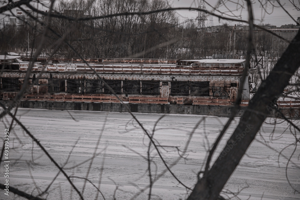 Old rusty abandoned ship behind the branches of trees. Frozen river. Winter snowy day.