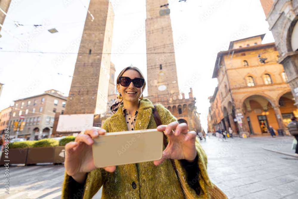 Young stylish woman taking selfie photo on phone on background of famous Asinelli towers while traveling in Bologna city. Concept of visiting Italian landmarks in Emilia Romagna region