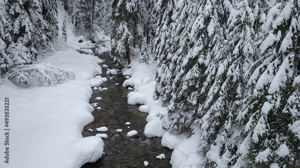 Panorama of frozen Jiet river flowing through a snowed coniferous forest. Winter Season, Carpathia, Romania.