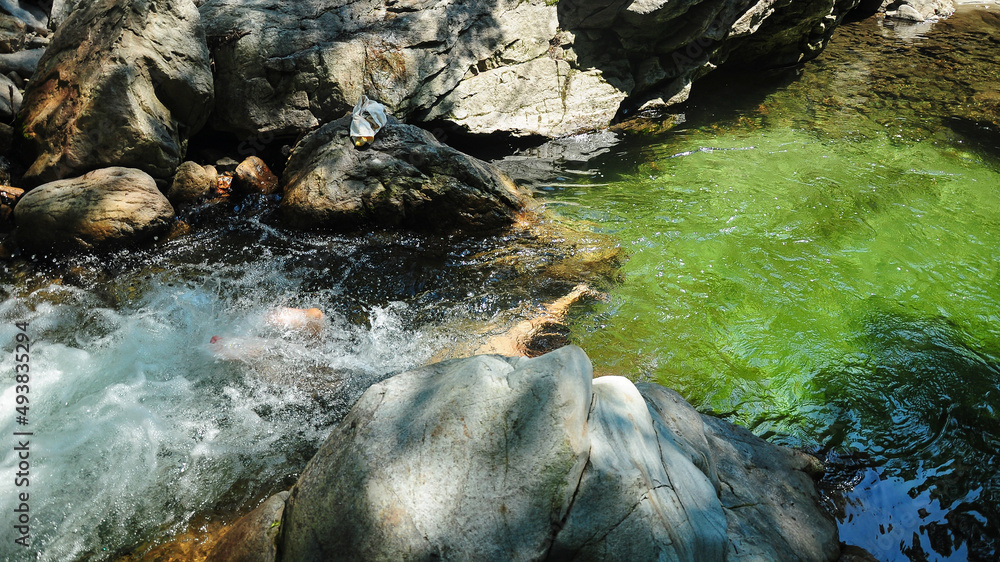 Swimming underwater, under a waterfall near large boulders in a cold mountain river. Refreshing outdoor activity during summer heat. Gilort river, Carpathia, Romania.