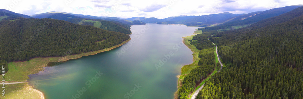 Aerial drone panorama of Vidra Lake. A lake located into the wild coniferous forests of Lotru Mountains, Carpathia, Romania.