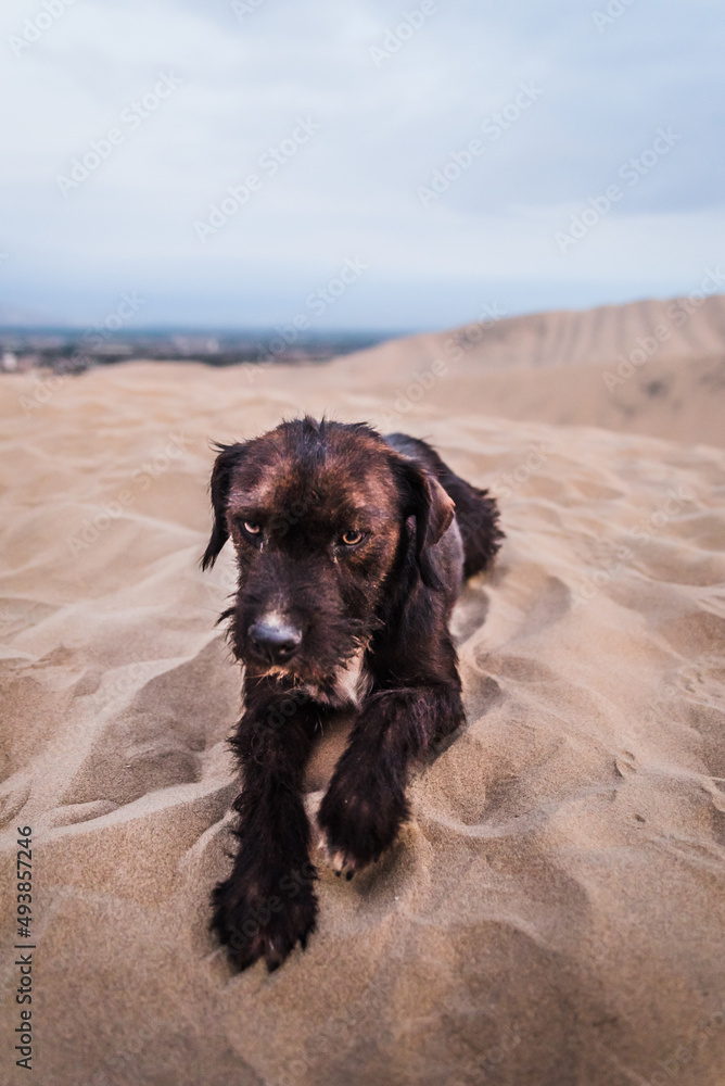 A stray dog on top of the sand dunes in Huacachina, Peru.