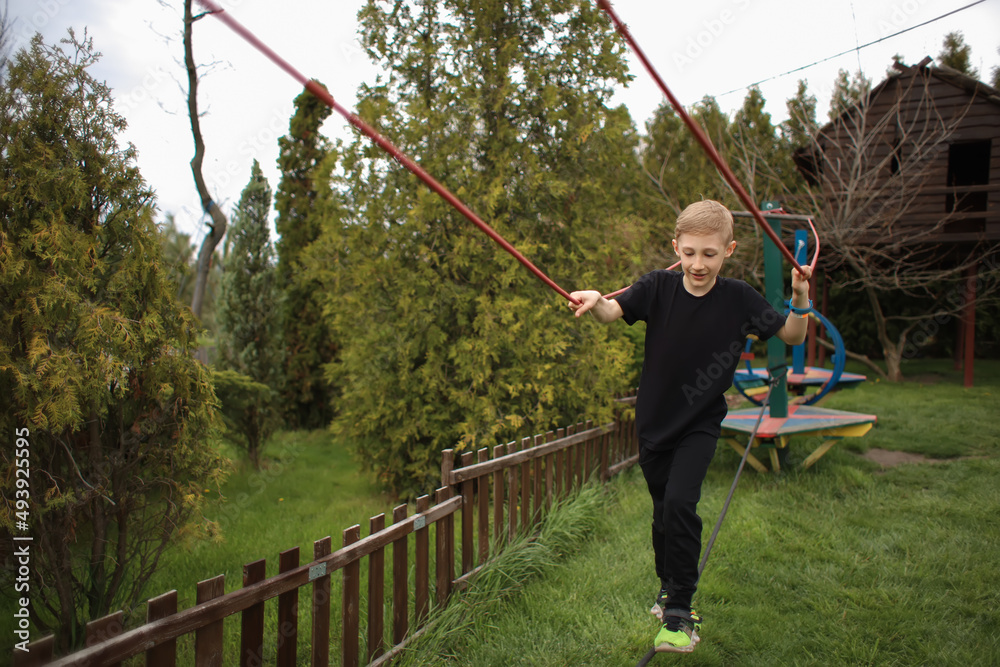 the boy goes through an obstacle course is engaged in active sports holding on to ropes to make his way to the finish line