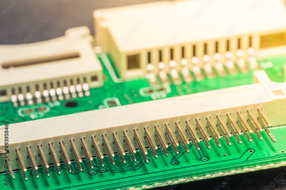 PCB board of a CF, micro SD and SD card reader. Electronic circuit elements and connection inputs on the PCB board. CF card reader slot connector pins in selective focus.