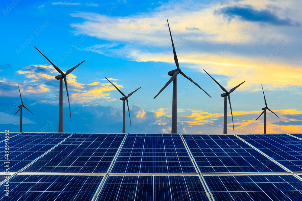 Wind turbines and solar panels at sunset. renewable energy concept.