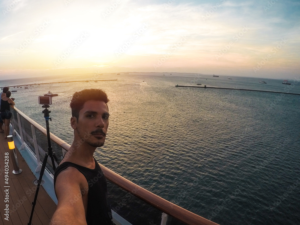 Portrait of a young black male tourist on the deck of a cruise ship in front of a sunset sky. African tourist on the beach trip.