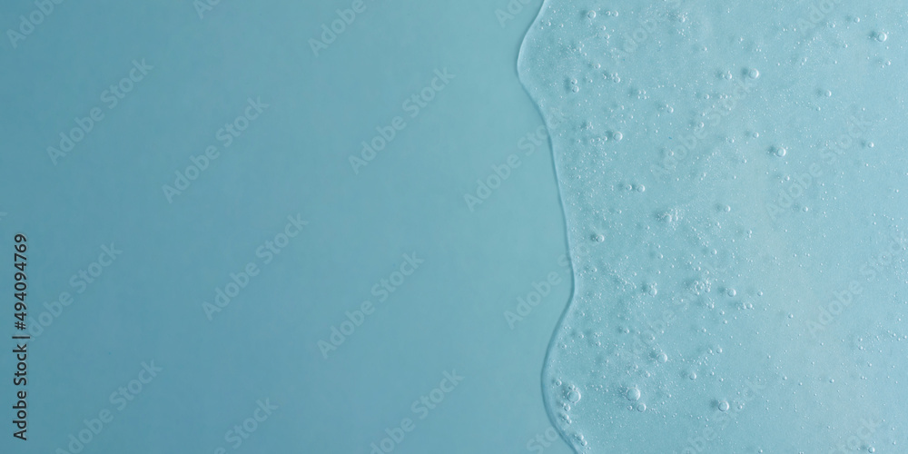 Background from cosmetic gel with bubbles,dripping down.Top view,antibacterial liquid surface.Good as background or mockup,large banner.