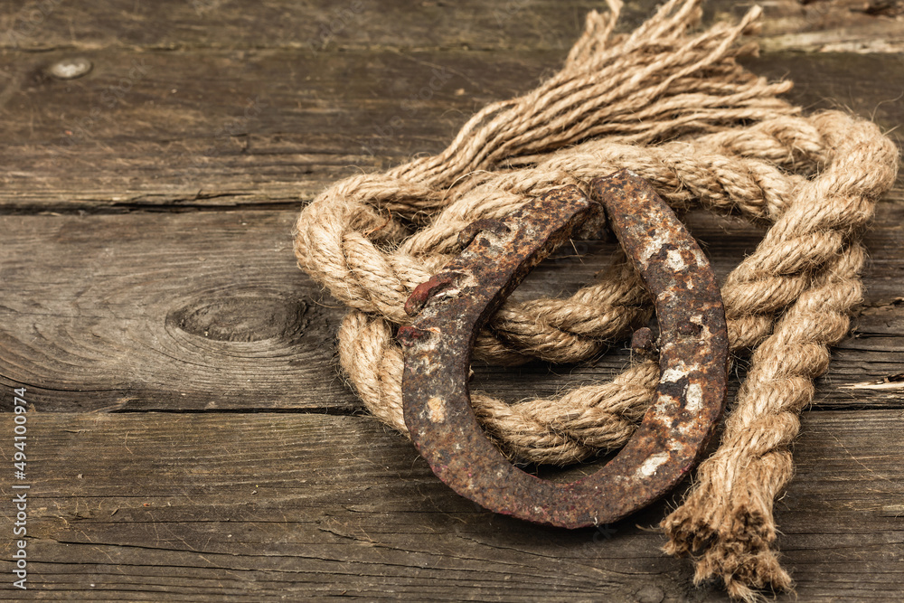 Horseshoe and vintage rope. Concept of good luck for St. Patrick's Day. Old wooden boards background
