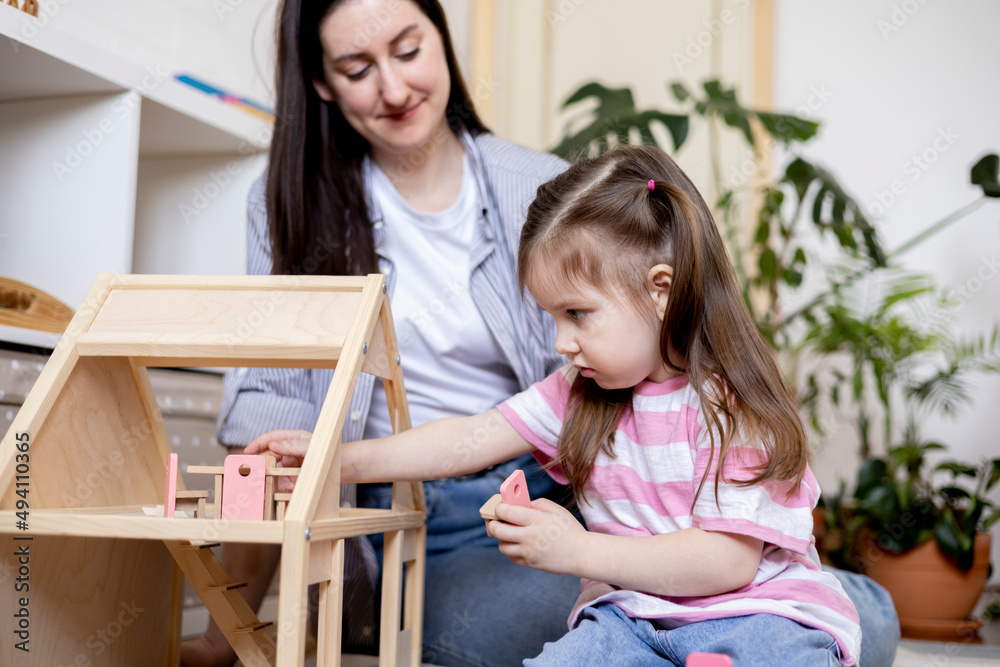Montessori material. Home education. Mom and daughter are learning dollhouse furniture.