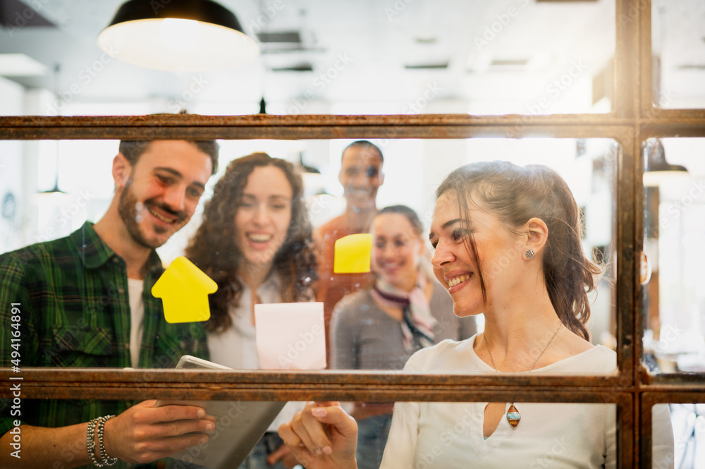 Young female with smile showing new strategy or plan to her colleagues. Shot through the window with teamwork using post stickers on window glass.