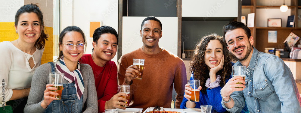 Horizontal banner or header portrait of Multiethnic group of young friends sitting at table eating pizza and drinking beer posing at camera with happy smiling expressions.
